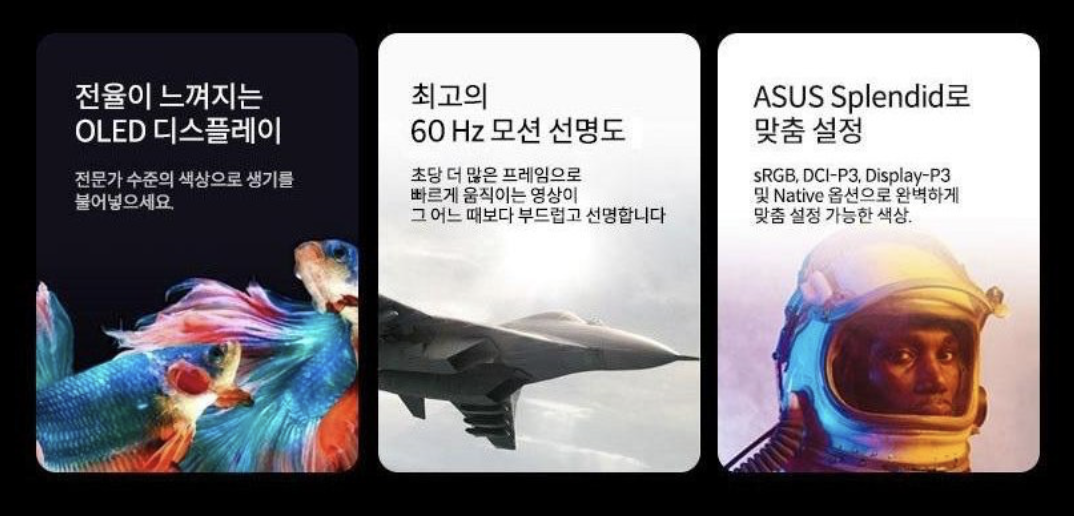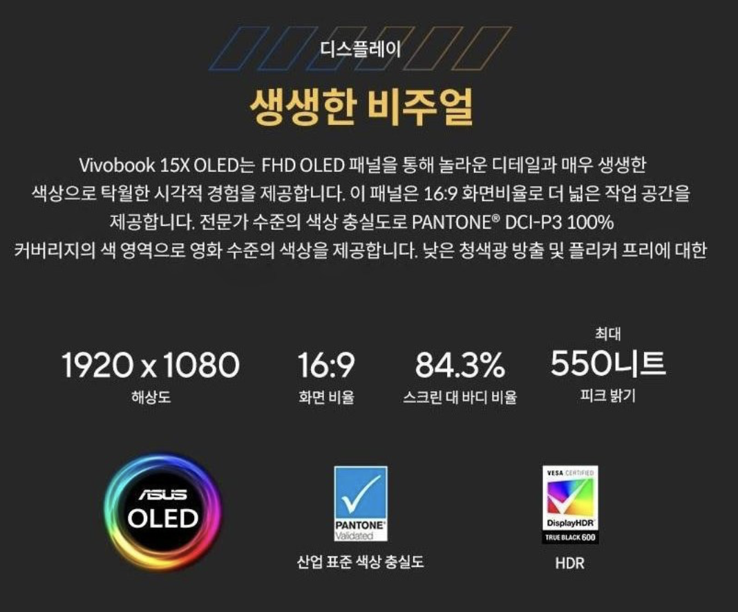- 15.6인치 OLED FHD(1920x1080) 디스플레이: 선명하고 생생한 화질, 100% DCI-P3 색역 지원