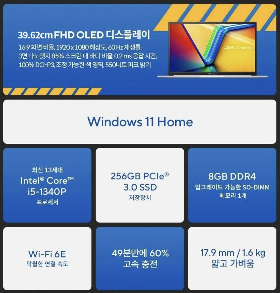 에이수스 2023 비보북 15X OLED 코어i5는 2023년에 출시된 노트북입니다. 15.6인치 OLED 화면, 강력한 성능, 긴 배터리 사용 시간을 제공하며, 학생, 직장인 등 다양한 사용자에게 적합합니다.