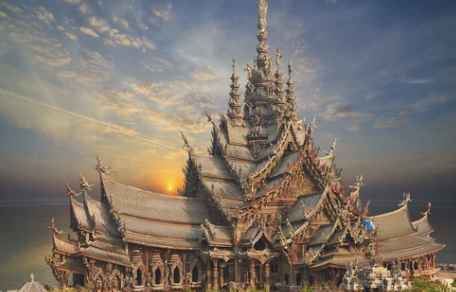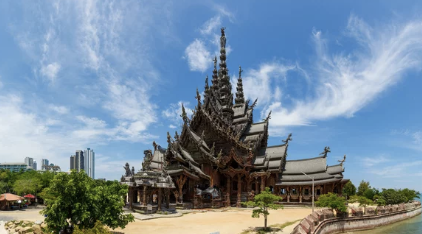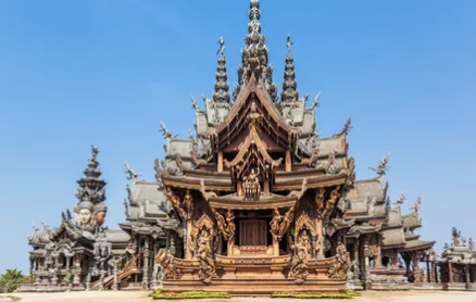 - 진리의 성전: 105m 높이의 거대한 목조 건축물로, 섬세한 조각과 화려한 장식이 압도적인 곳입니다. 태국 전통 건축 양식과 불교, 힌두교, 이슬람교 등 다양한 종교의 철학이 담겨 있습니다.
