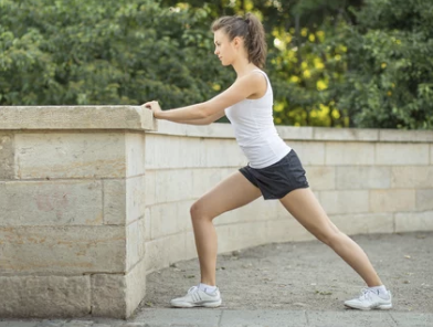 - 계단 스트레칭: 계단에 발 앞부분을 대고 뒤꿈치를 아래로 내려 종아리가 당기는 느낌이 들 때까지 스트레칭합니다.