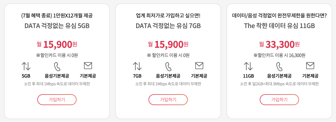 - U+알뜰모바일 유심 통화마음껏 데이터 맘껏 15GB+: 월 3만원대에 데이터 15GB, 음성/문자 무제한 제공하는 가성비 좋은 요금제입니다. 데이터 소진 후에도 3Mbps 속도로 무제한 이용 가능합니다.