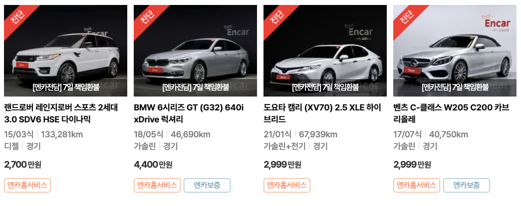 - 엔카보증: 중고차의 품질을 보장하는 서비스입니다. 엔카가 선정한 우수한 매물에 대해 1년 무상 보증을 제공하며, 차량 결함이 발생할 경우 무료로 수리해줍니다.