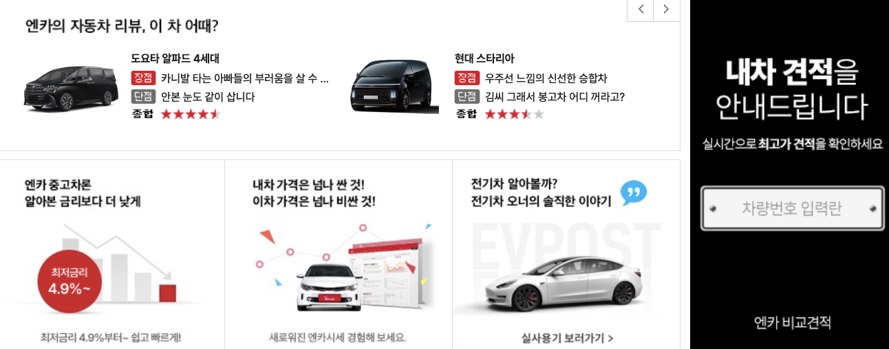 - 중고차 시세: 중고차의 가격을 알 수 있는 서비스입니다. 엔카가 실시간으로 수집한 국내 최대의 중고차 거래 데이터를 바탕으로, 차량별로 평균가와 최저가를 제공해줍니다.