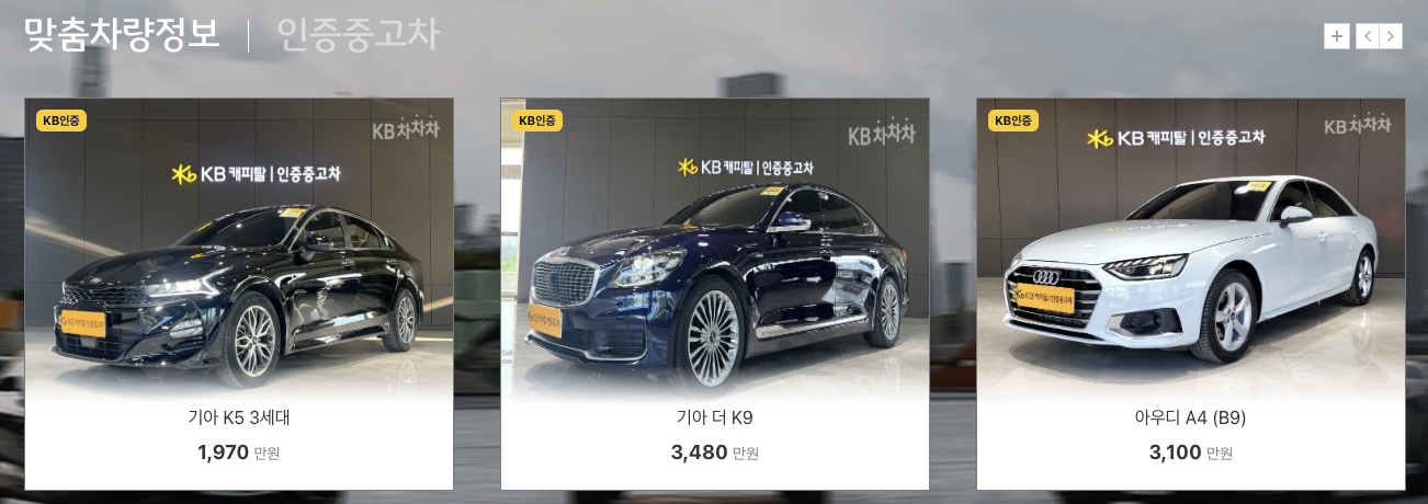 - 중고차 매물대수 1위: KB차차차는 국내 최다 중고차 매물대수를 보유하고 있습니다. 현재 13만여대의 중고차가 등록되어 있으며, 국산, 수입, 인증, 리스, 홈배송 등 다양한 차종과 판매구분을 선택할 수 있습니다. 또한, 원하는 조건에 맞는 차량을 쉽게 검색하고 비교할 수 있는 편리한 인터페이스를 제공합니다.