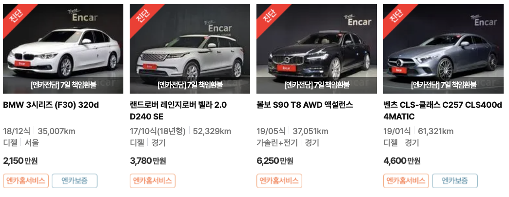 - 엔카진단: 중고차의 상태를 정확하게 알 수 있는 서비스입니다. 엔카가 인증한 전문가가 차량을 200여개 항목에 걸쳐 꼼꼼하게 점검하고, 진단 결과를 온라인으로 제공해줍니다.