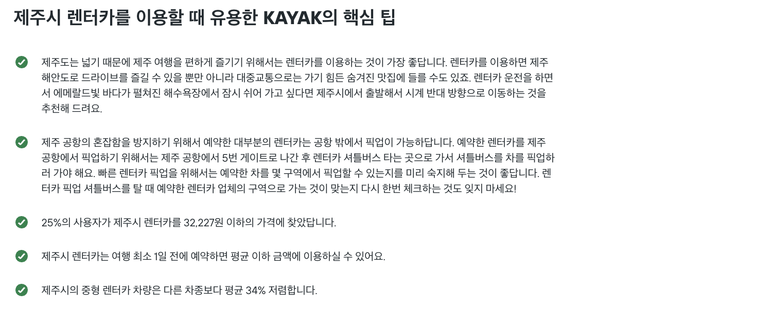 제주도에서의 렌트카는 여행의 자유도를 크게 향상시키며, KAYAK을 이용하면 여러분은 더욱 스마트하고 효율적인 방법으로 이를 실현할 수 있습니다. 제주도의 아름다운 해안가를 따라 드라이브를 하거나, 숨겨진 명소를 찾아가는 여정에 KAYAK은 여러분의 든든한 동반자가 될 것입니다. 렌트카를 통해 제주도의 다채로운 풍경과 문화를 경험하고 싶다면, KAYAK은 여러분의 여행을 한층 더 쉽고 즐겁게 만들어줄 선택지가 될 것입니다.